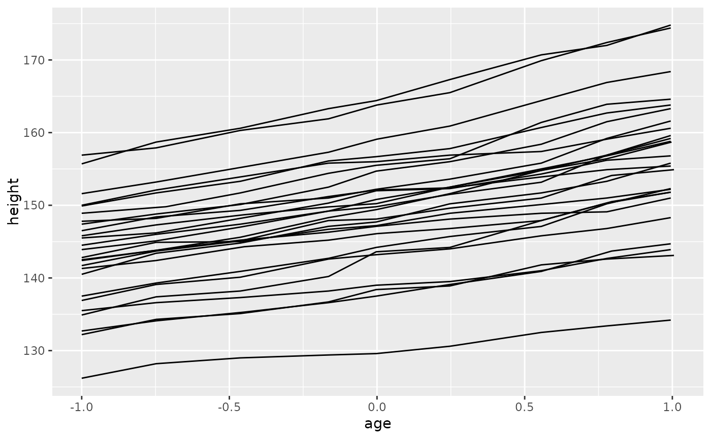 p <- ggplot(nlme::Oxboys, aes(age, height))