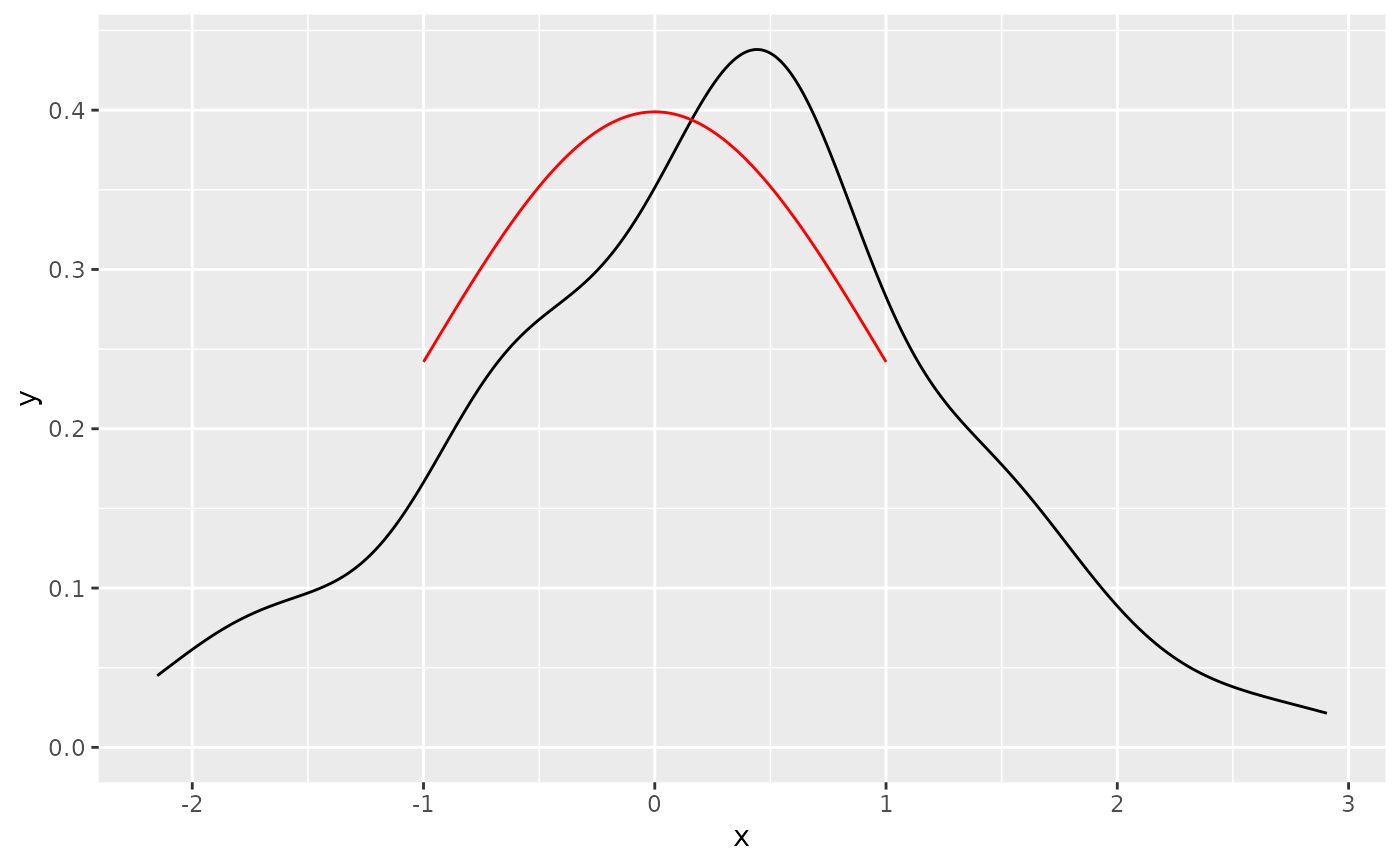 geom_function(fun = dnorm, colour = "red", xlim=c(-1, 1))
