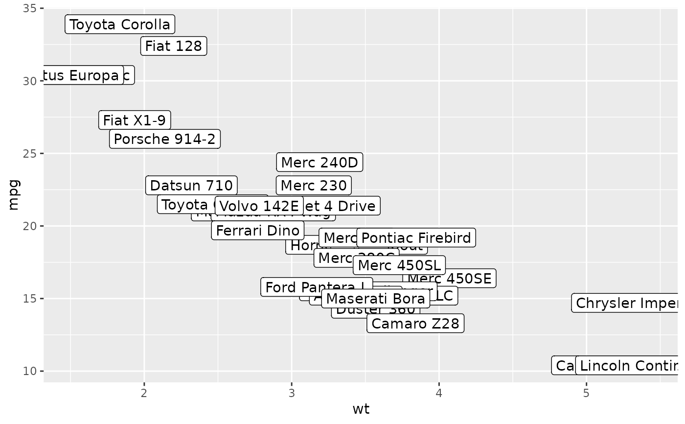 p <- ggplot(mtcars, aes(wt, mpg, label = rownames(mtcars)))