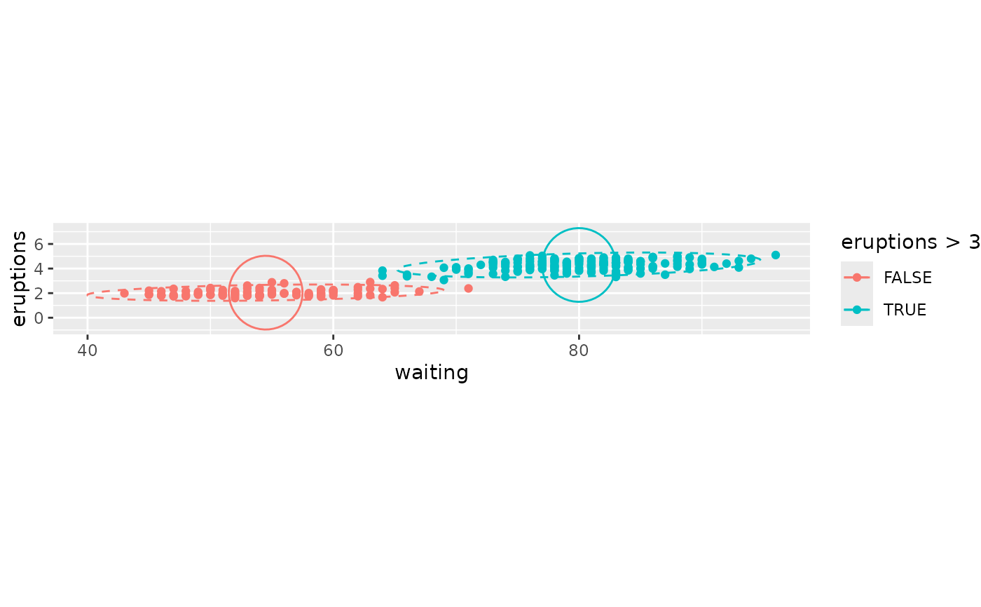 ggplot(faithful, aes(waiting, eruptions, fill = eruptions > 3)) +